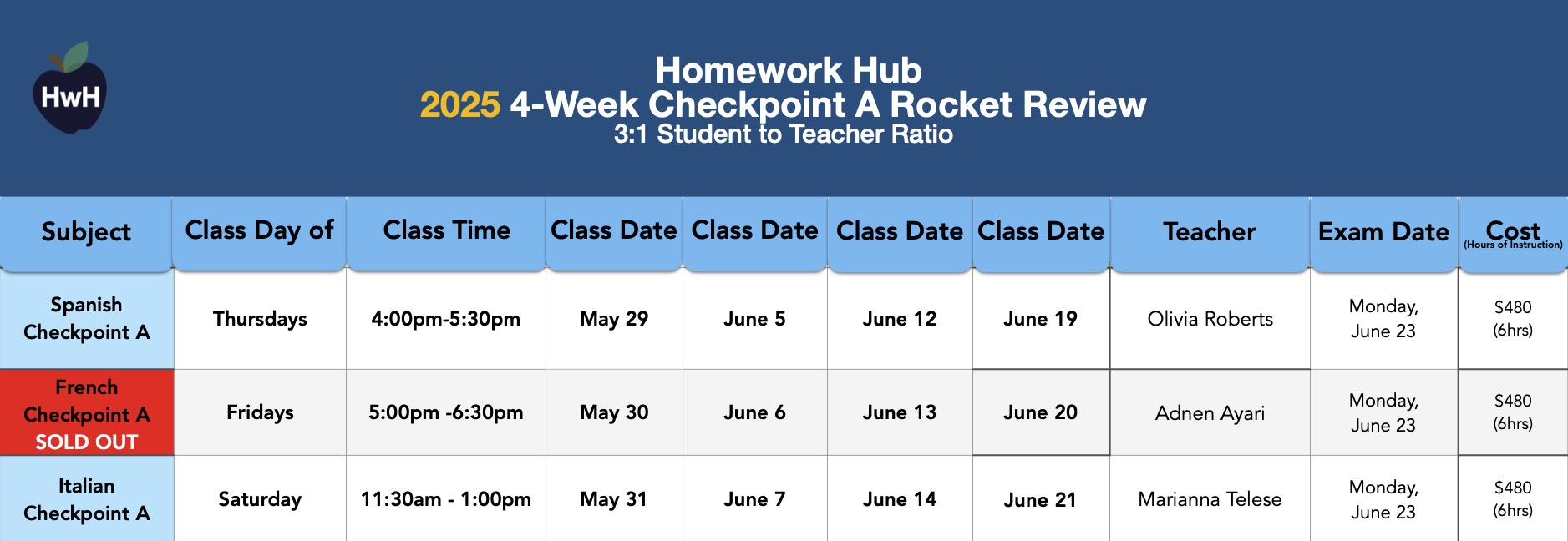 Our Four Week NYSLA Reviews are 1½ hour classes that run over four weeks for a total of six hours of instruction. French Checkpoint A is 2-hour classes that run over three weeks for a total of six hours of instruction.