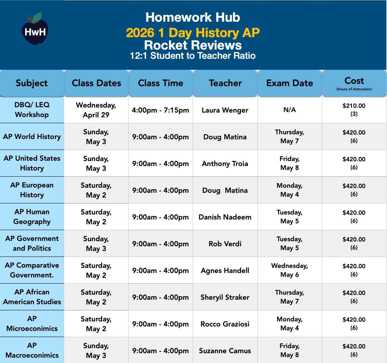Our One-Day AP Rocket Review classes are 7 hours long totaling 6 hours of instruction. Each class includes two 15-minute snack breaks and a 1/2-hour lunch break.