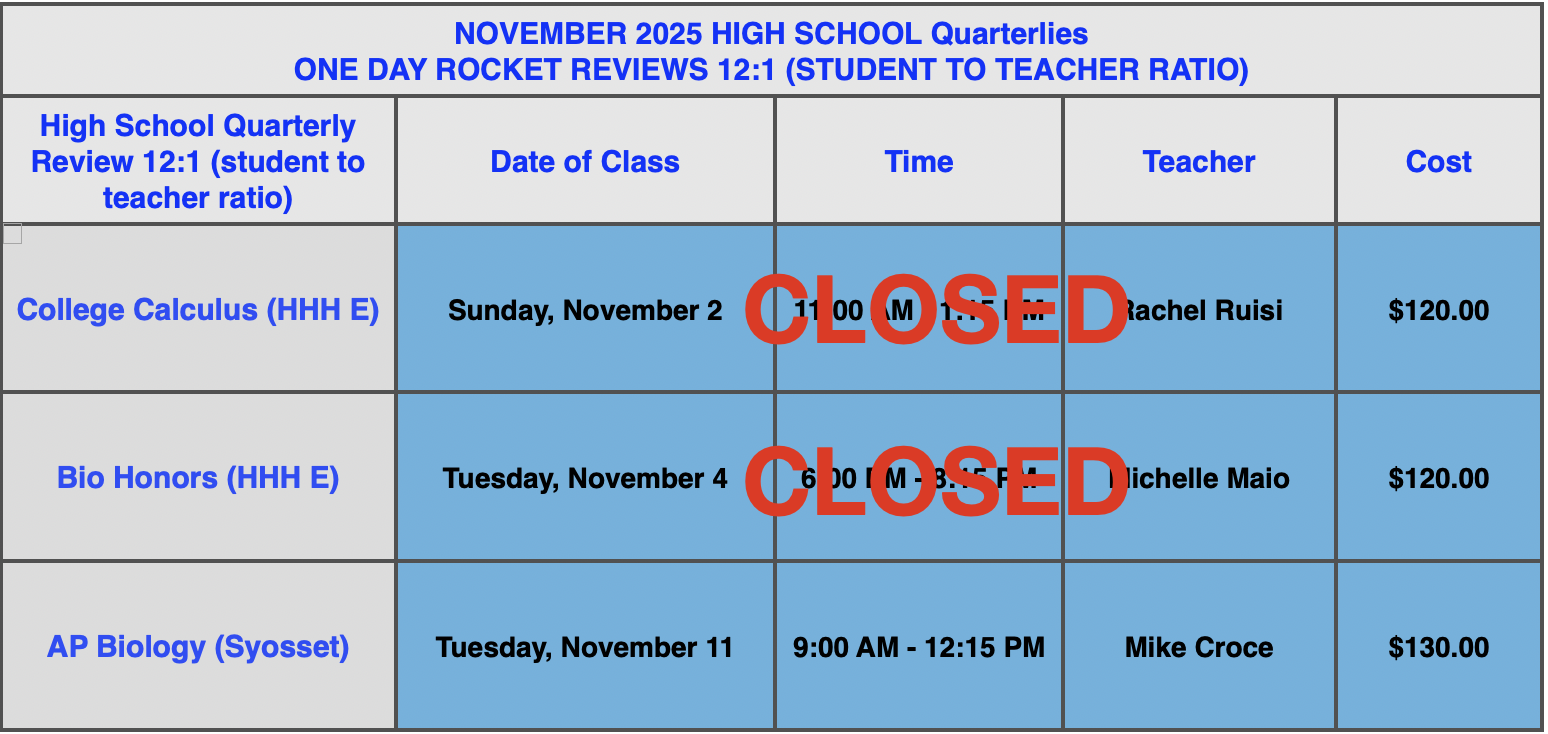 Our High School Regents and Honors Quarterly Review classes are 2 hours and 15 minutes long. Our AP Quarterly Review classes are 3 hours and 15 minutes long. Each class includes 2 or 3 hours of instruction and a 15-minute snack break. Snacks will be provided.