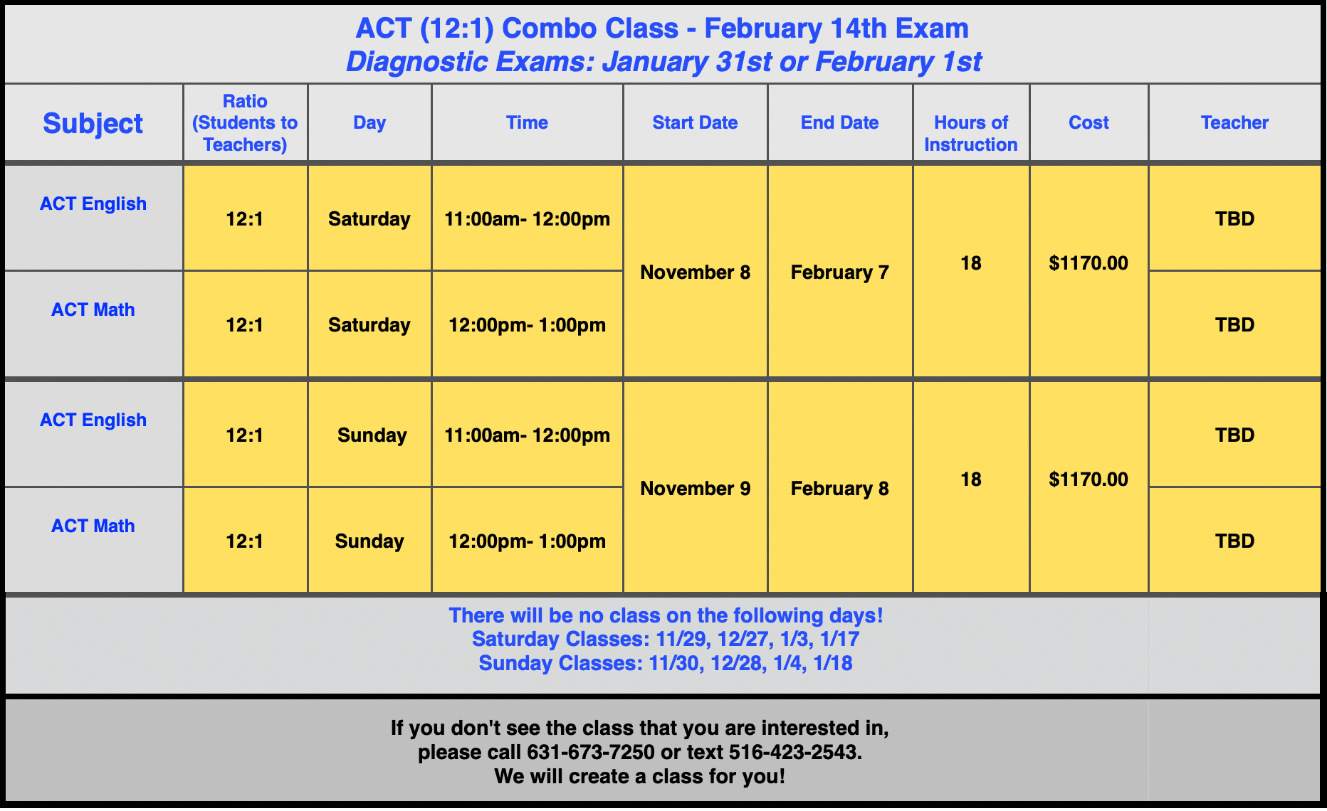 This program has a [12:1] student-to-teacher ratio. It is intended as an introductory course for students prepping for the ACT exam for the first time. Each class is divided into different subject areas and taught by a teacher certified in that specific discipline. This class is not grouped by academic level.