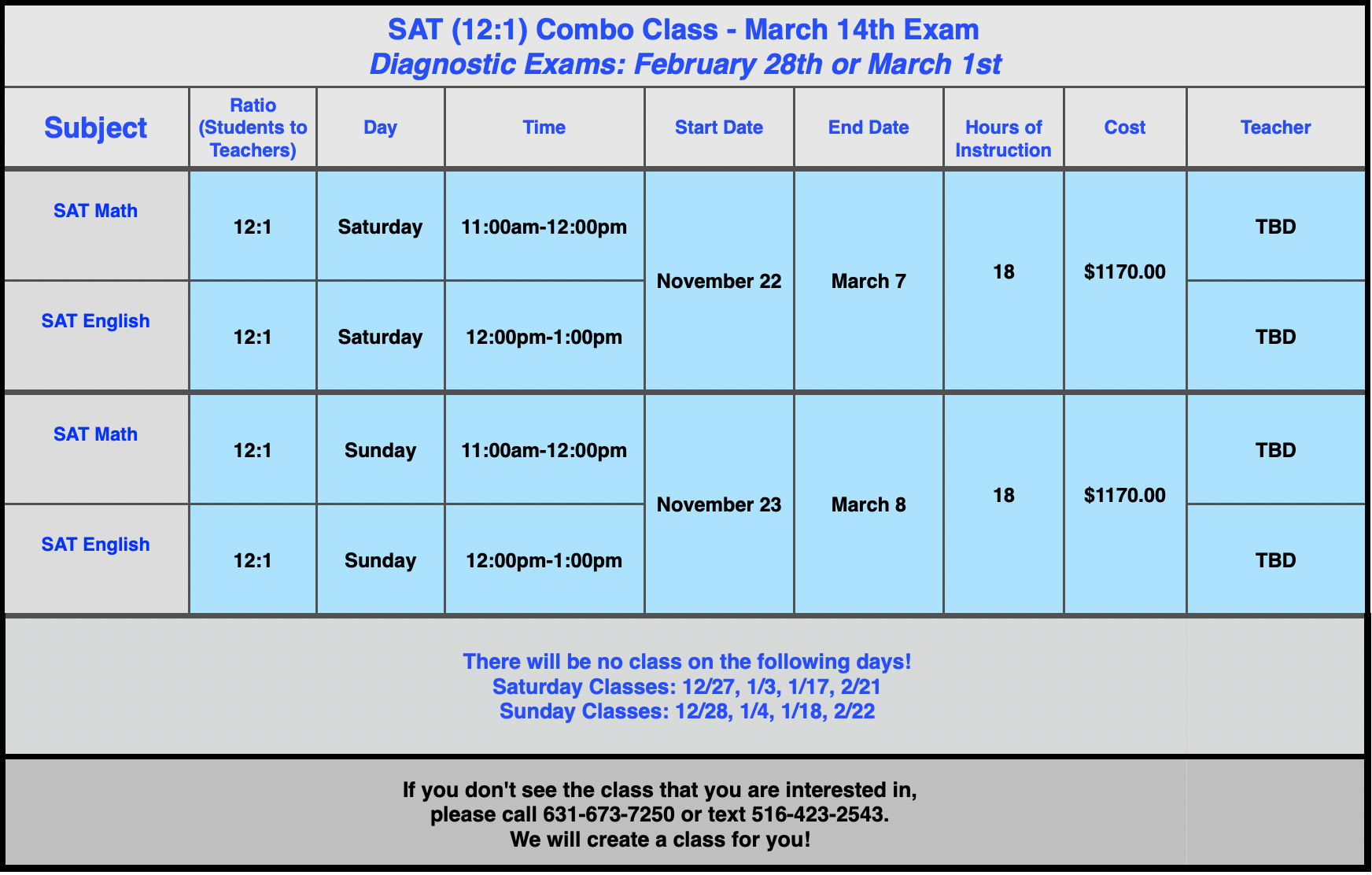 This class has a [12:1] student-to-teacher ratio. It is intended as an introductory course for students prepping for the SAT exam for the first time. Each class is divided into different subject areas and taught by a teacher certified in that specific discipline. Please note class is not grouped by academic level.