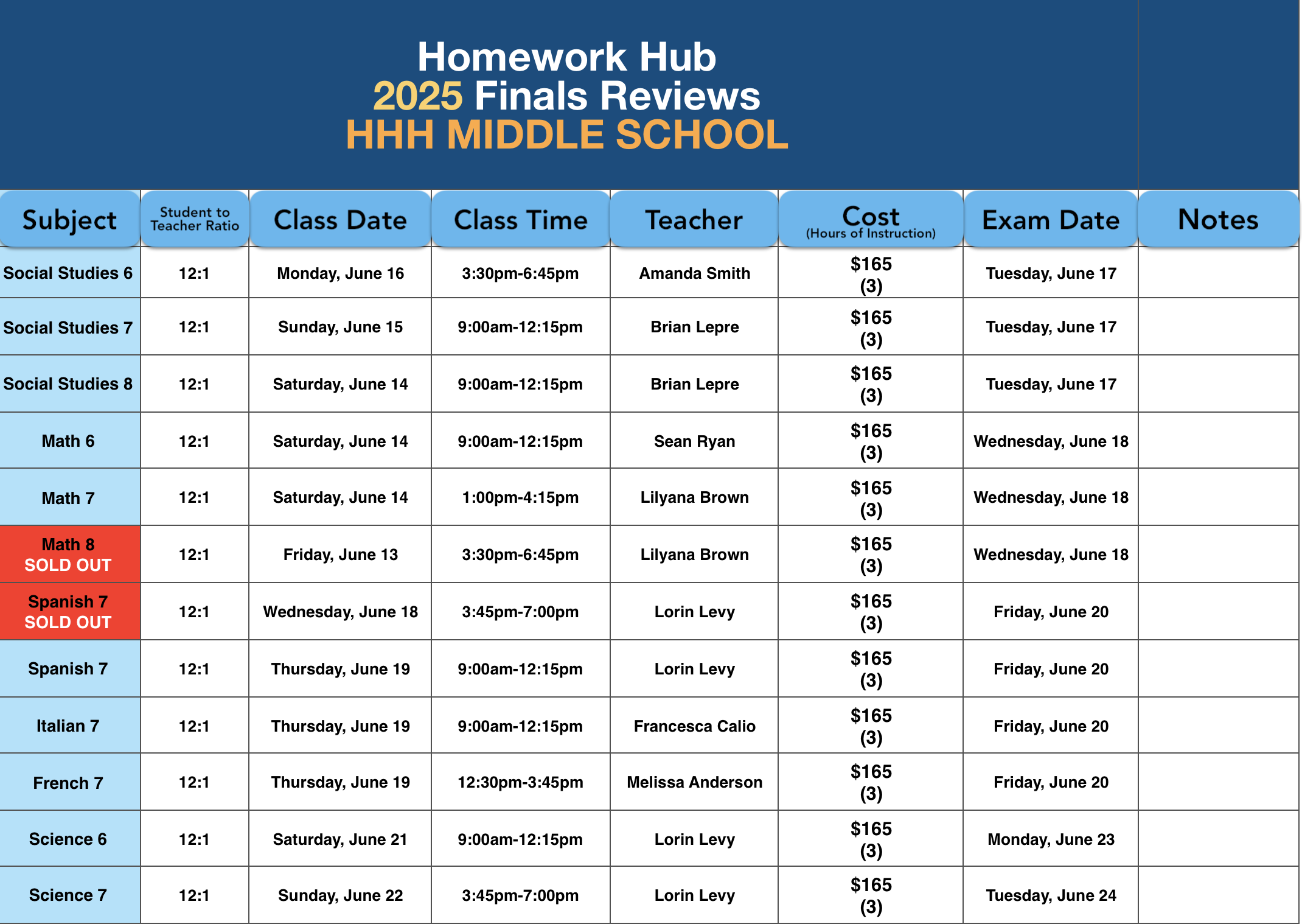 Our Middle School Finals review classes are 3 hours and 15 minutes long totaling 3 hours of instruction. Each class includes a 15-minute snack break. Snacks will be provided.