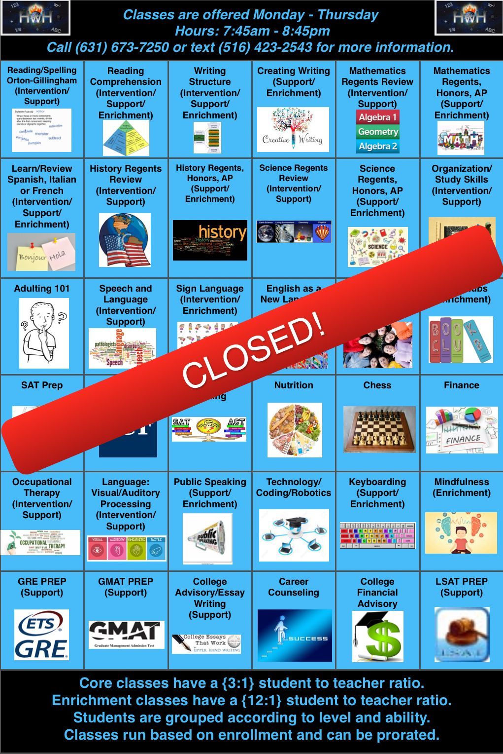 HwH+ summer classes are sold as a package. Each session runs for either four or six weeks. All core subjects and intervention classes have a {3:1} student-to-teacher ratio. Our enrichment and test prep programs are also kept at a small class size of no more than 12 students. Classes run based on enrollment (minimum of 2 students). Classes can be prorated upon registration.
